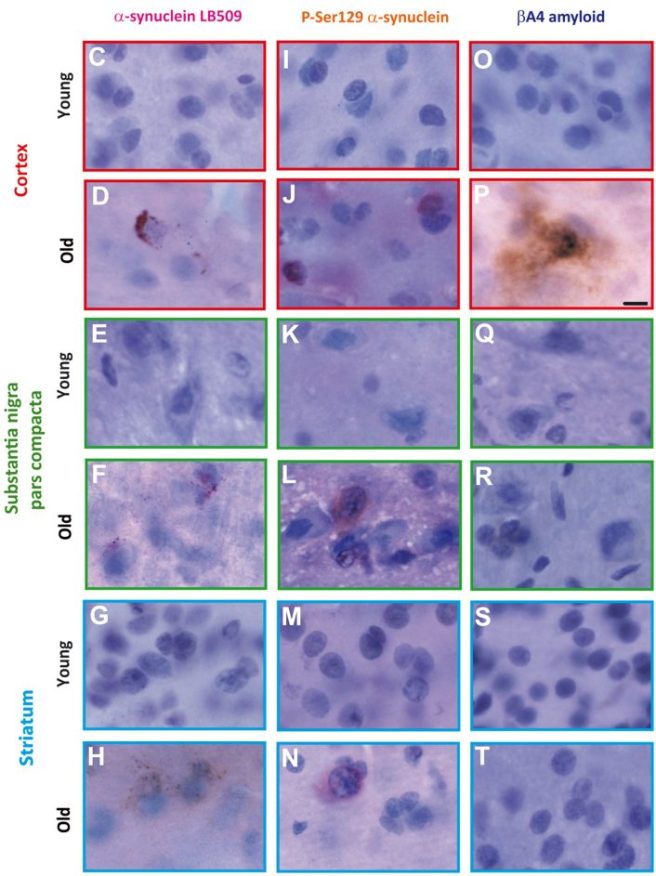 The analysis of the investigators suggests that yes, there is aggregation of alpha synuclein in the brains of these primates, but only in the aged animals (particularly in the cortex regions of the brain – see panels D & J in the image below, where alpha synuclein is stained in brown).