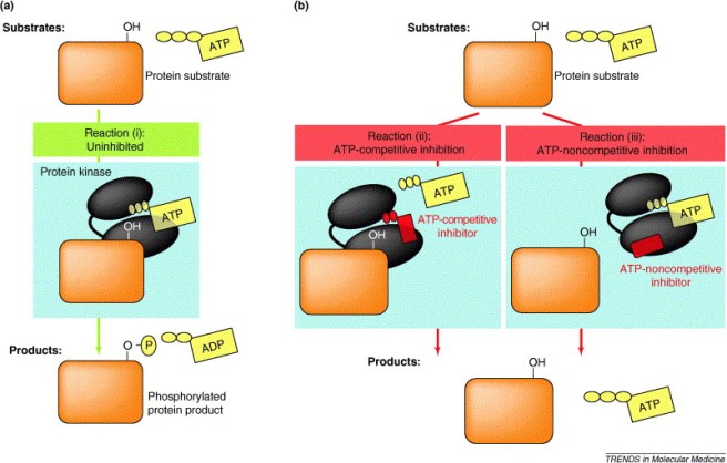 Therefore, interest in developing non-ATP competitive inhibitors has risen considerably over the years. Non-ATP competitive inhibitors are compounds that bind to the enzyme and block its ability to do its function regardless of whether ATP has been bound (see panel b in the image above).