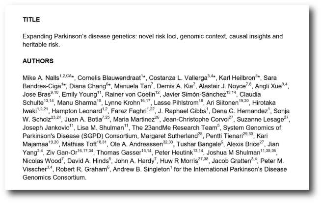 Authors: Nalls MA, Blauwendraat C, Vallerga CL, Heilbron K, Bandres-Ciga S, Chang D, Tan M, Kia DA, Noyce AJ, Xue A, Bras J, Young E, von Coelln R, Simón-Sánchez J, Schulte C, Sharma M, Krohn L, Pihlstrom L, Siitonen A, Iwaki H, Leonard H, Faghri F, Gibbs JR, Hernandez DG, Scholz SW, Botia JA, Martinez M, Corvol J-C, Lesage S, Jankovic J, Shulman LM, The 23andMe Research Team, System Genomics of Parkinson’s Disease (SGPD) Consortium, Sutherland M, Tienari P, Majamaa K, Toft M, Andreassen OA, Bangale T, Brice A, Yang J, Gan-Or Z, Gasser T, Heutink P, Shulman JM, Wood N, Hinds DA, Hardy JA, Morris HR, Gratten J, Visscher PM, Graham RR, Singleton AB for the International Parkinson’s Disease Genomics Consortium.