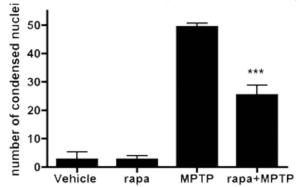 In this study, the researchers found that rapamycin (“rapa”in the image below) was able to protect cells in various neurotoxin-based models of Parkinson’s.