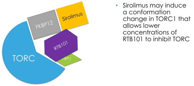 The reason the researchers are using Sirolimus is because they are keen to learn if it changes the shape of the TORC1 protein complex, which would allow a lower dose of RTB101 to be used over time. Can using both drugs in combo allow for lower doses of both, as opposed to high doses of them being used by themselves.