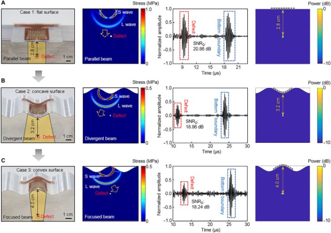 In this study, the investigators reported on the invention of an ultra thin (240 μm) membrane-based, stretchable (with strains up to 60%), ultrasound probe that can conform to any shape and provide imaging or monitoring (with a high signal-to-noise ratio, a wide bandwidth, and a high spatial resolution.