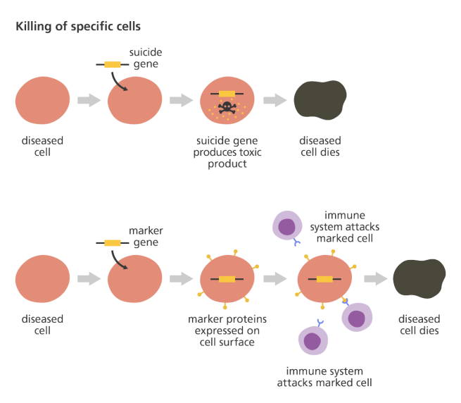 Alternatively, a gene can be introduced into a cell which would cause the cell to produce a protein that that cell usually does not produce. This sort of approach is being used in gene therapy for cancer, where ‘suicide genes’ are being introduced into cancer cells. These cause the cancer cell to die, by initiate an auto-destruct sequence resulting in cell death (a process called apoptosis). Another approach the cancer field is using is introducing a gene into cancer cells that cause a protein to be produced on the surface of the cancer cell that attracts the attention of the immune system. This ‘marker gene’ causes the immune system to attack the cancer cell, resulting in the death of the cancer cell.