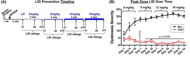 The researchers started their experiment by injecting rats with the virus producing microRNA for CaV1.3. The virus was injected into a region of the brain called the striatum, which is where dopamine neurons release much of their dopamine. Next they induced a model of Parkinson’s using a neurotoxin (6-OHDA) and then they started treating the animals with high doses of Levodopa to cause Levodopa induced dyskinesias (see panel A in the image below for a schematic of this study design).