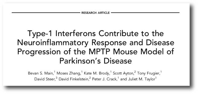 In this study, the researchers reported increased levels of type-1 interferon in both post mortem brains from people who passed away with Parkinson’s and neurotoxin-based (MPTP) mouse models of Parkinson’s.