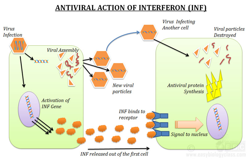They are a family of signaling proteins, which are made and released by cells in your body in response to a viral infection. Interferons causes nearby cells to be on the alert, and to heighten their anti-viral defenses.