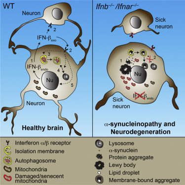 The researchers found that absense of interferon-β causes a blockade of the waste disposal process in the cell (called autophagy) which results in a build up of alpha synuclein protein. By re-introducing interferon-β into the cells, the scientists could promote autophagy and help clear the accumulating alpha synuclein protein.