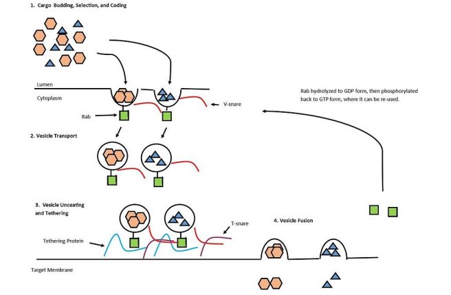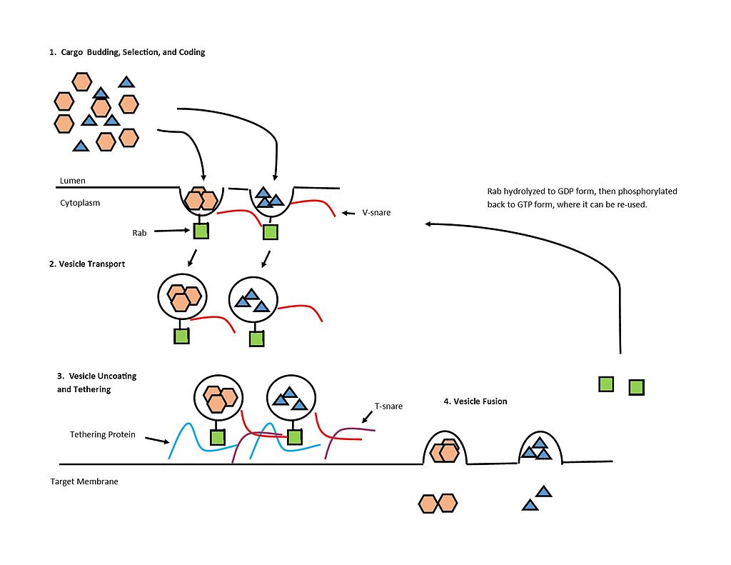 These proteins regulate the transportation of vesicles (the small bags of necessary proteins that live within a cell) between different membranes within cells. In the basic image below, you can see an examples of how Rab proteins (green squares) are involved with transporting vesicles.