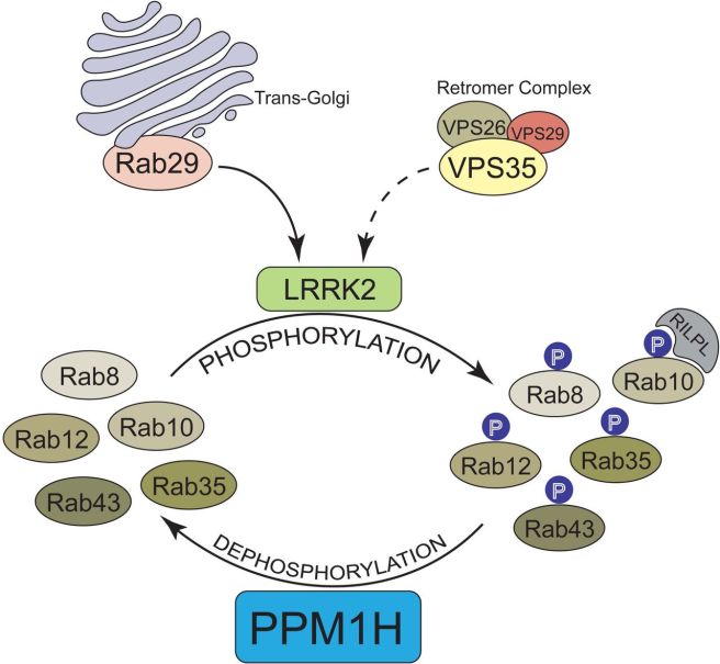 LRRK2 phosphorylates RAB proteins, but there are other phosphatases that dephosphorylate RAB proteins. LRRK2 and these other phosphatases work in opposition to each other – phosphorylating and dephosphorylating proteins, respectively.