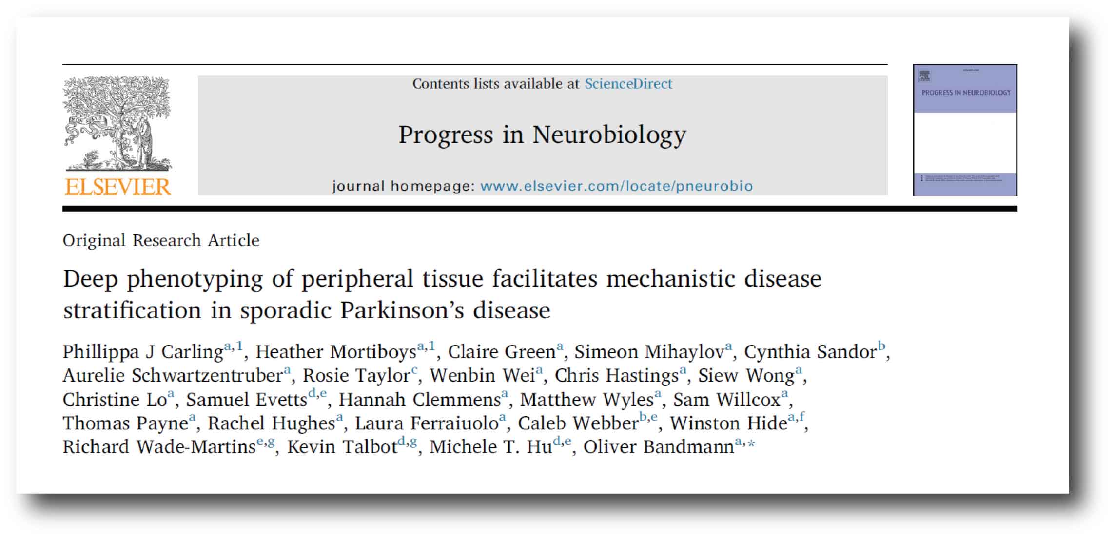 Authors: Carling PJ, Mortiboys H, Green C, Mihaylov S, Sandor C, Schwartzentruber A, Taylor R, Wei W, Hastings C, Wong S, Lo C, Evetts S, Clemmens H, Wyles M, Willcox S, Payne T, Hughes R, Ferraiuolo L, Webber C, Hide W, Wade-Martins R, Talbot K, Hu MT, Bandmann O.