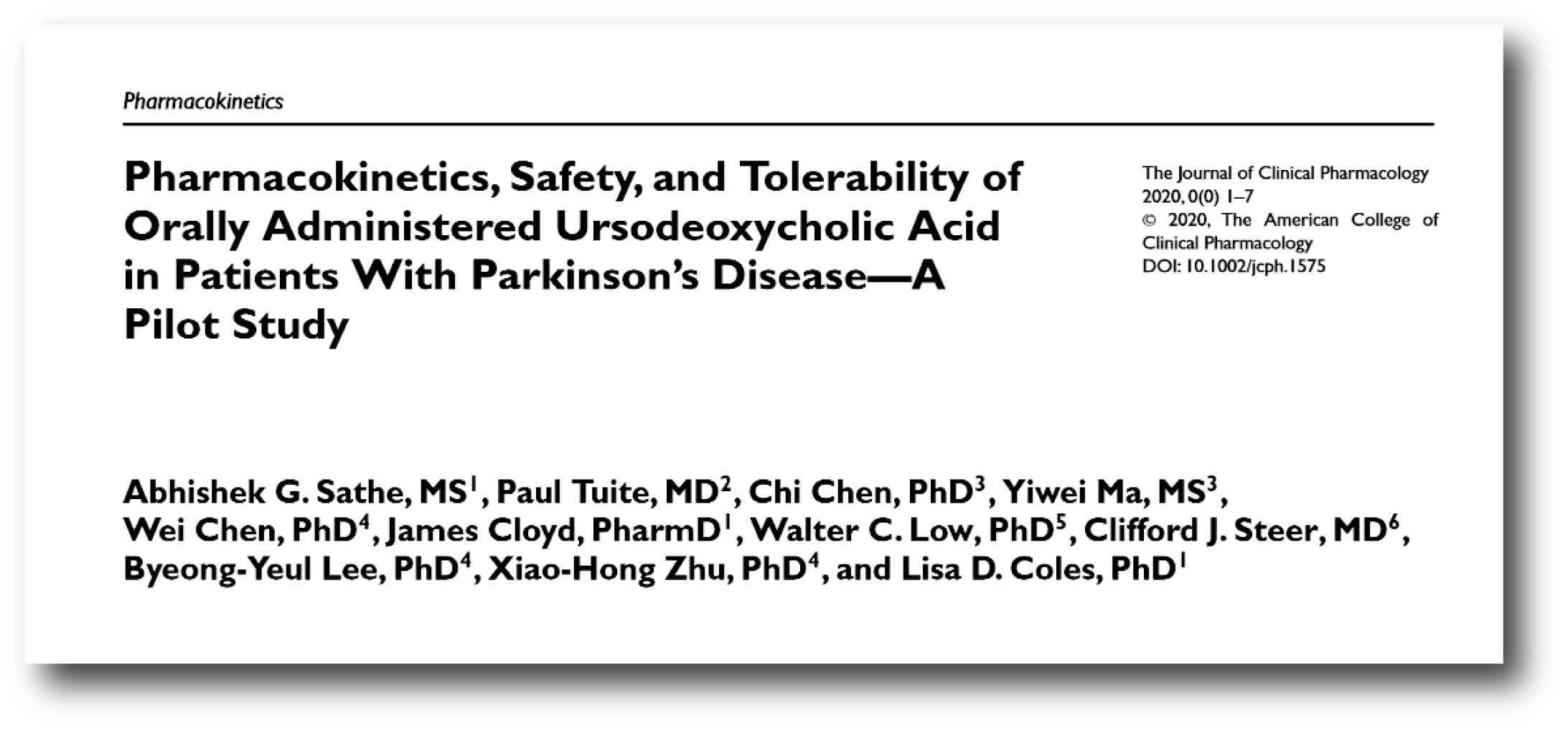 Title: Pharmacokinetics, Safety, and Tolerability of Orally Administered Ursodeoxycholic Acid in Patients With Parkinson’s Disease-A Pilot Study.