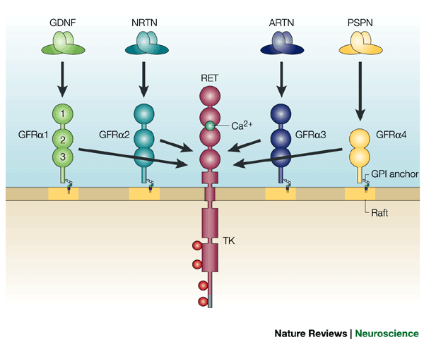 There are receptors that are specific for each of these GDNF family members, and when they bind to their respective receptor, they activate another surface protein called RET.