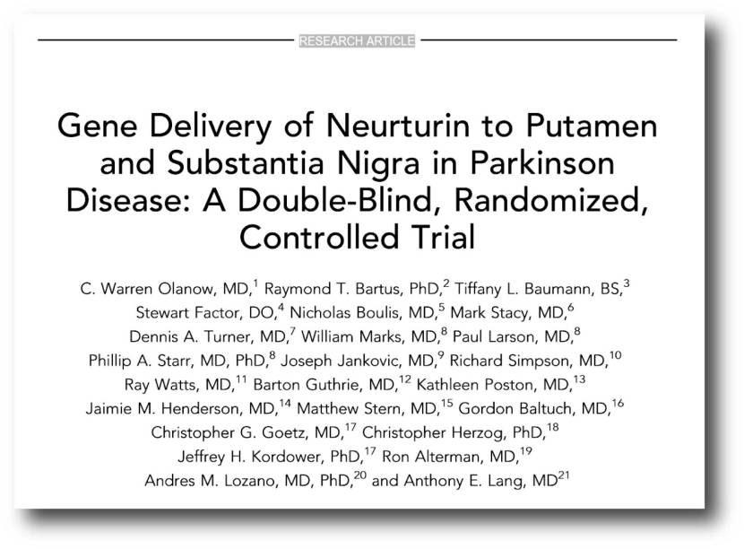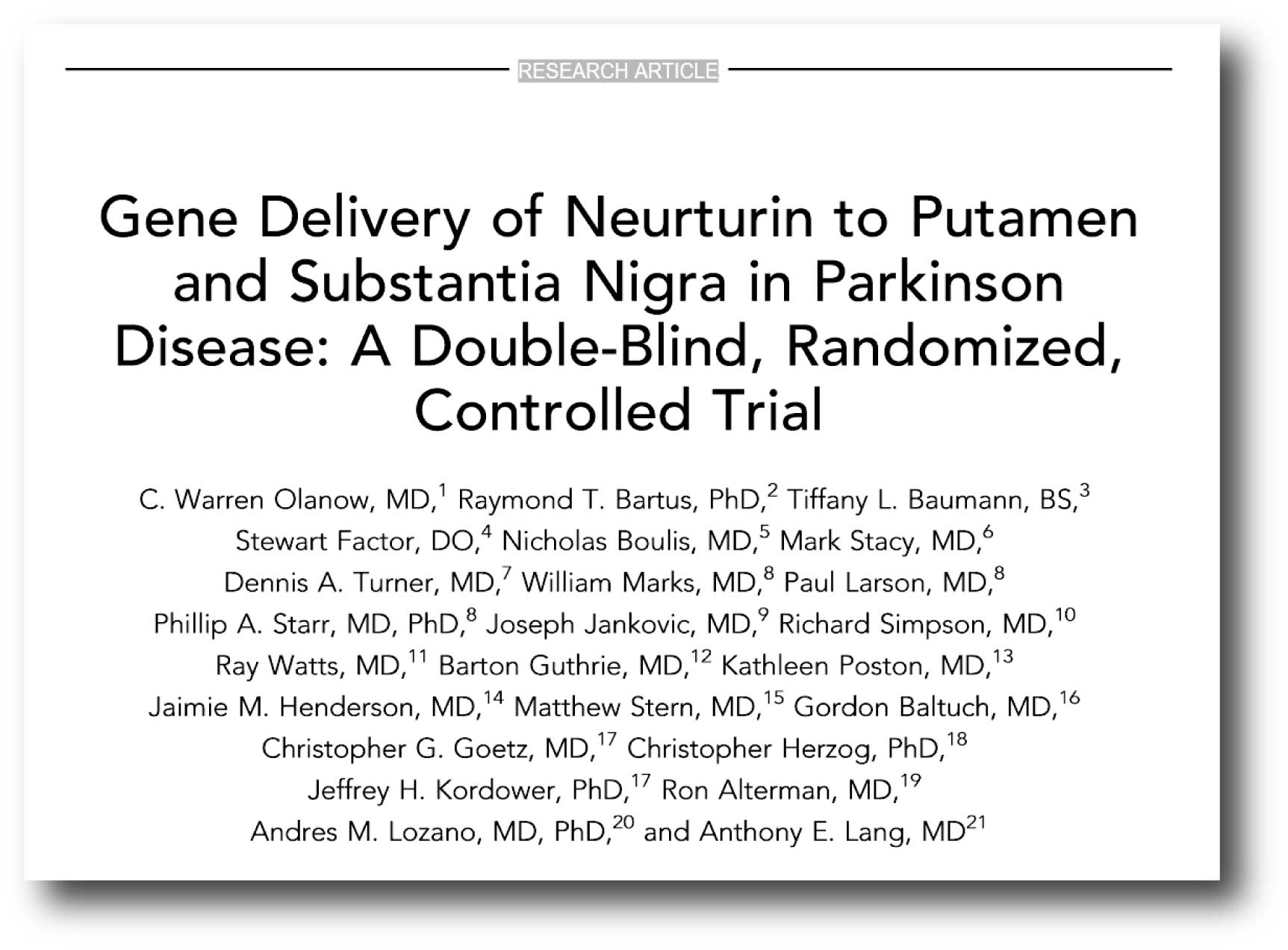 Authors: Warren Olanow C, Bartus RT, Baumann TL, Factor S, Boulis N, Stacy M, Turner DA, Marks W, Larson P, Starr PA, Jankovic J, Simpson R, Watts R, Guthrie B, Poston K, Henderson JM, Stern M, Baltuch G, Goetz CG, Herzog C, Kordower JH, Alterman R, Lozano AM, Lang AE.