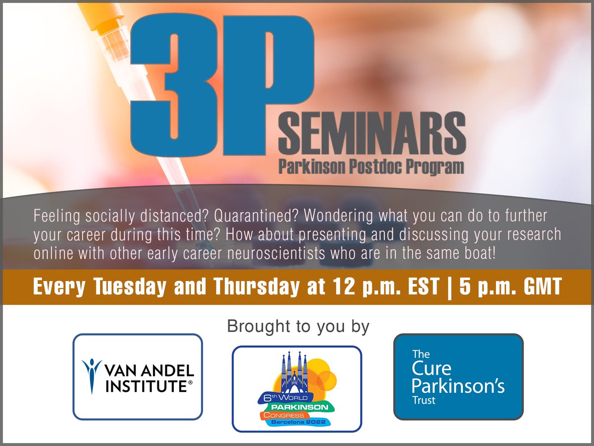Check out both 3Pseminars (being co-ordinated by the Van Andel Institute and The Cure Parkinson’s Trust) and also PD seminars (which is supported by Parkinsons’s UK). 3Pseminars will be held on Tuesdays and Thursdays (both at 5pm UK, 12pm EST), and PD seminars will be on Fridays (at 12pm UK).