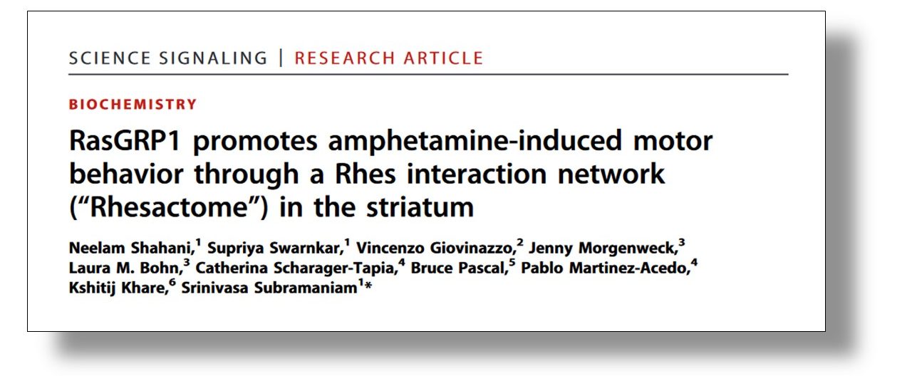 Title: RasGRP1 promotes amphetamine-induced motor behavior through a Rhes interaction network (“Rhesactome”) in the striatum.