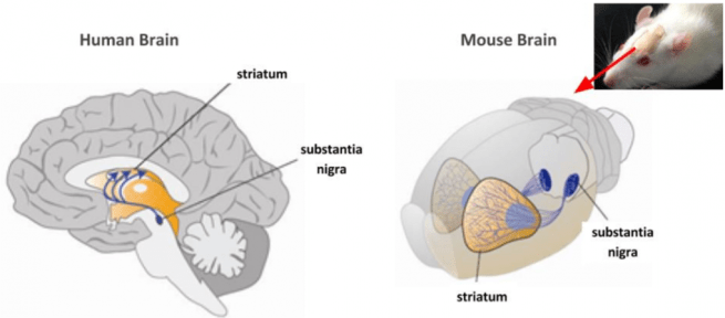 In the image below you can see a comparison between the dopamine neurons (blue) in the substantia nigraof the human brain with the dopamine neurons in the same region of the mouse brain (blue). Both sets of neurons project their branches to the striatum (it doesn’t really need to be said, but these brains are not drawn to scale).