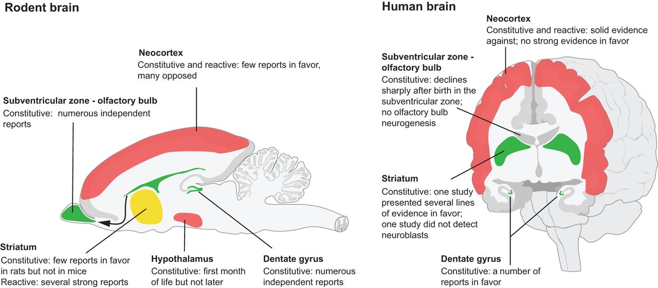 Neurogenesis in the adult human and rodent brain primarily isolated to two regions: the subventricular zone of the striatum and the subgranular zone of the hippocampus (see the green regions in the image below).