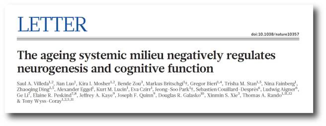 Authors: Villeda SA, Luo J, Mosher KI, Zou B, Britschgi M, Bieri G, Stan TM, Fainberg N, Ding Z, Eggel A, Lucin KM, Czirr E, Park JS, Couillard-Després S, Aigner L, Li G, Peskind ER, Kaye JA, Quinn JF, Galasko DR, Xie XS, Rando TA, Wyss-Coray T.