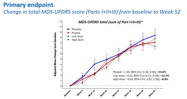 The primary end point for Part 1 of the PASADENA study was “a difference in the Movement Disorder Society-Unified Parkinson’s Disease Rating Scale (MDS-UPDRS) total score (Parts I, II and III) between treatment and control groups”. Important to understand that the primary end point here was a combination of Parts I, II and III of the MDS-UPDRS.