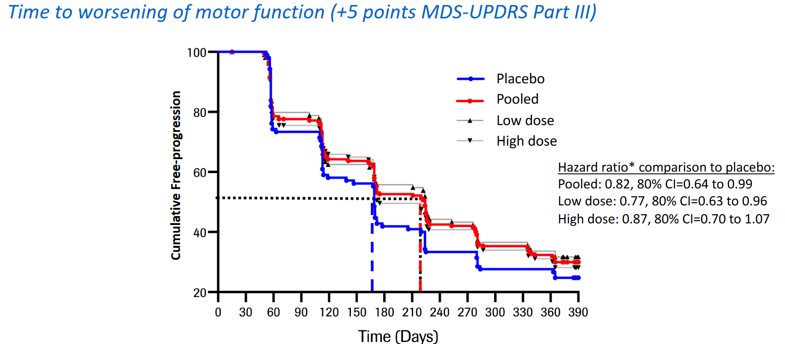 For example, the researchers also looked at the time to worsening of motor function. That is to say, how long did it take each participant to reach +5 points extra on their MDS-UPDRS Part III score. And here they found that the placebo treated group reached this mark sooner (50% of them at ~160 days) than the prasinezumab treated groups (at ~220 days). See the blue line (placebo-treated group) in the graph below is lower than the combined prasinezumab treated groups (red line), indicating more rapid progression in terms of motor features in the placebo group (compared to the prasinezumab treated groups):