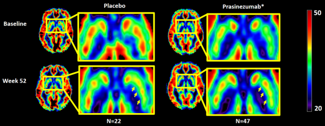 And there was another interesting difference in the data: The researchers used brain imaging to assess changes in cerebral blood flow in different brain regions in 69 participants (22 in the placebo group and 47 in the prasinezumab treated groups). They found that the prasinezumab treated groups exhibited a reduction in decline in cerebral blood flow in a region of the brain called the putamen, which is badly affected in Parkinson’s.
