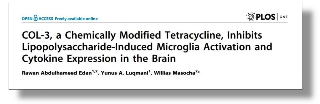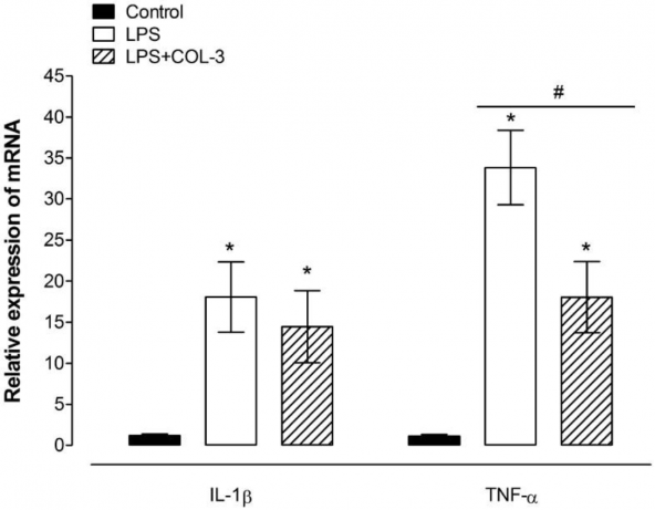In this study, the researchers reported that COL-3 (CMT-3) inhibited microglial activation (brought on by lipopolysaccharide (LPS) treatment) and reduced levels of TNF-α (a messenger protein involved with encouraging inflammation in the body).