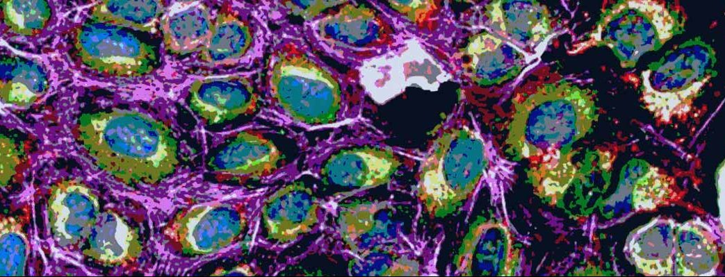 Using certain dyes, the researchers can label the different organelles inside cells. These dyes can be applied in unison, allowing for different organelles to be analysed at the same time. In the image below you can see 5 different dyes being used on two different cell cultures (top row vs bottom row) to label different types of organelles: