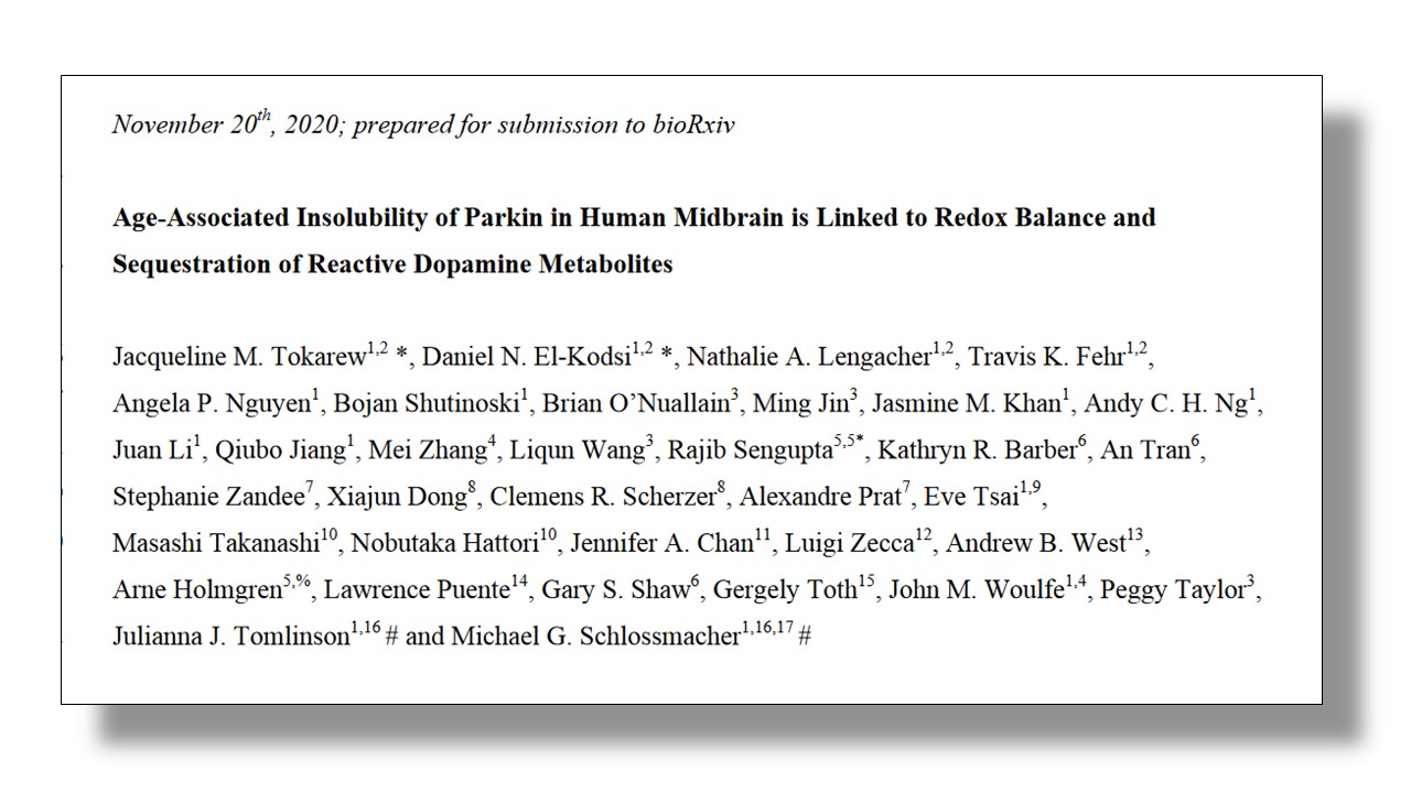 Authors: Tokarew JM, Kodsi DNE, Lengacher NA, Fehr TK, Nguyen AP, Shutinoski B, O’Nuallain B, Jin M, Khan J, Ng ACH, Li J, Jiang Q, Zhang M, Wang L, Sengupta R, Barber K, Tran A, Zandee S, Dong X, Scherzer CR, Prat A, Tsai E, Takanashi M, Hattori N, Chan JA, Zecca L, West A, Holmgren A, Puente L, Shaw GS, Toth G, Woulfe J, Taylor P, Tomlinson JJ, Schlossmacher MG