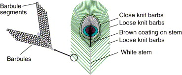 Peacock tail feathers develop to ensure that they reveal each ocellus whenever the bird fans them out – there is very little overlapping. The feather has a central shaft, which is lined by rows of smaller barbs that contain minute barbules (projecting filaments).
