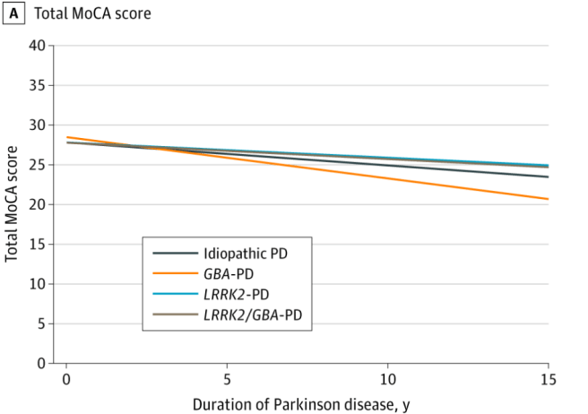 And when the researchers (who conducted the study we are reviewing today) looked at the clinical scores of the GBA-associated Parkinson’s and LRRK2-associated Parkinson’s cases in their data set, this is exactly what they saw: over time, cases of GBA-associated Parkinson’s were more rapid than idiopathic PD, and LRRK2-associated Parkinson’s cases were slower than idiopathic PD.