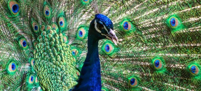 To the observer, the ocelli appear in different shades of blues and greens, but tail feathers are actually pigmented brown and the iridescent colours of the feathers are created by structural coloration.