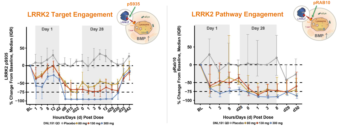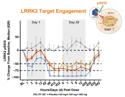 Treatment with DNL151 was also associated with a dose-dependent reduction in di-22:6-BMP, a specific species of bis[monoacylglycerol] phosphate (BMP), which is another marker of lysosomal function (lysosomes are key components of the waste disposal system inside of cells):