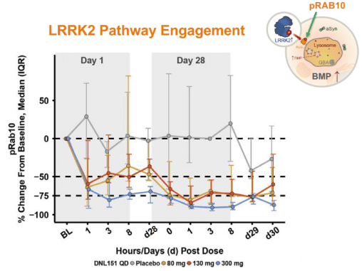 This result suggested that DNL151 could reduce the hyperactivity of LRRK2. And this finding was supported by measures of another biomarker, phosphorylated RAB10 (pRAB10), which was less than half of the levels that were reported in the placebo group across all of the three doses tested in the Parkinson’s patients: