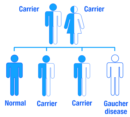 Gaucher disease is considered an autosomal recessive disorder. This means that two copies of an abnormal gene must be present in the individual in order for the disease to develop. A person with just one faulty gene will not get sick, but they will be a carrier. To develop Gaucher disease, you need to have two genetic mutations in the GBA gene – one from your mother and one from your father.