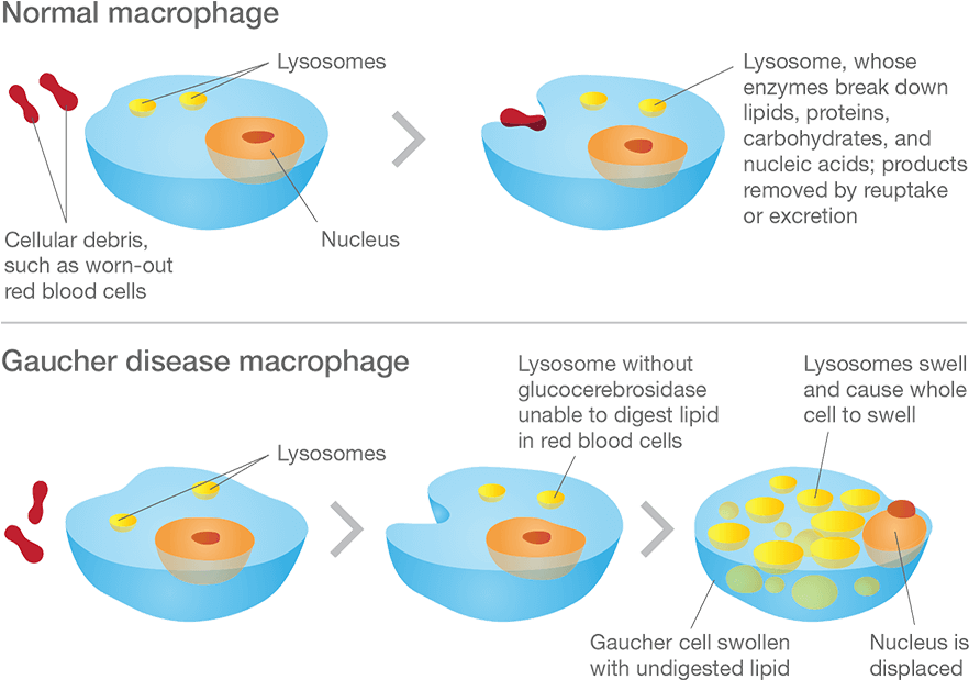 As you can see in the image below, without glucocerebrosidase, the macrophage has trouble digesting certain fatty molecules like glucocerebrosides and the lysosomes start to accumulate in the cell, causing the cell to swell up.