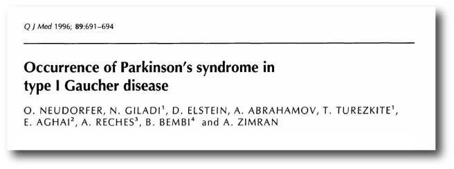 In this study, the Israeli researchers report on 6 people with Type I Gaucher disease (which up until that point had not been considered neuronopathic). All six of the subjects also exhibited the hallmark of a rather severe form of Parkinson’s, which made its appearance in the 4th to 6th decade of life and displayed an aggressive progression and was largely unresponsive to conventional anti-Parkinson therapy (such as L-dopa).