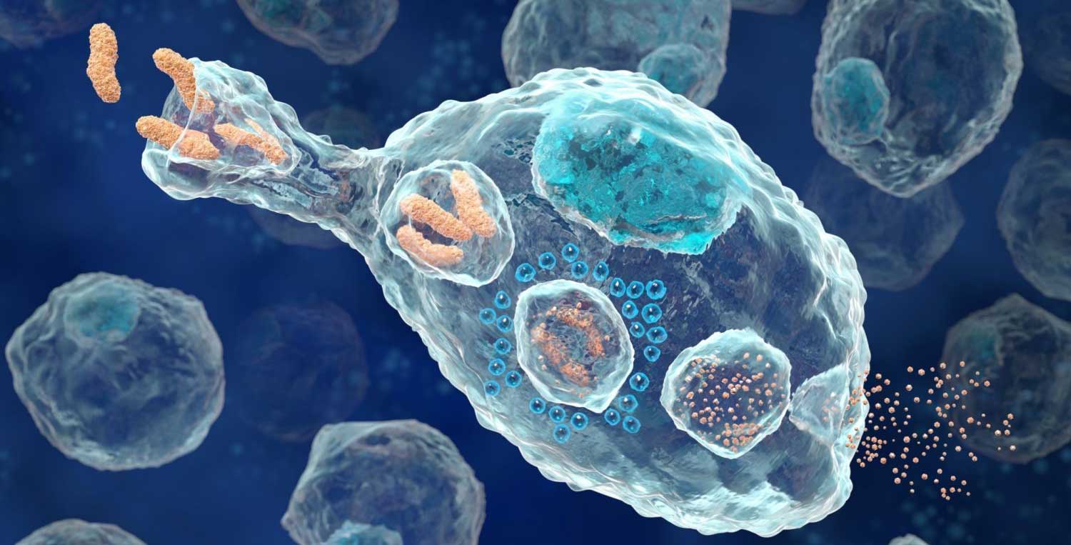 Macrophage are one type of cell that is particularly affected in Gaucher disease. They are a type of blood cell that is responsible for detecting, engulfing and destroying dangerous pathogens and apoptotic cells. Below is a schematic of a macrophage, consuming orange pathogens (left), digesting them, and releasing the waste (on the right):
