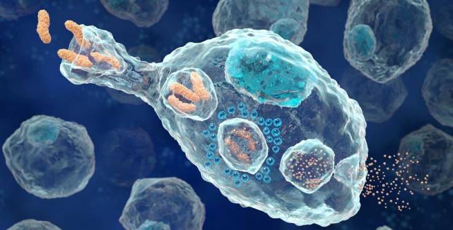 Macrophage travel the body, swallowing anything that they don’t like the look of. In order to break down everything it swallows, a macrophage must have a full complement of digestive enzymes. These enzymes are usually stored in the macrophage in small sacks known as lysosomes.