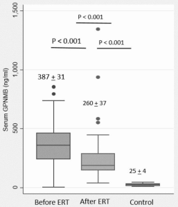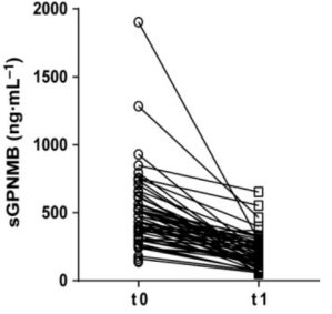 Interestingly, when the individuals with Gaucher disease started the standard treatment for the condition, the levels of GPNMB collectively dropped: