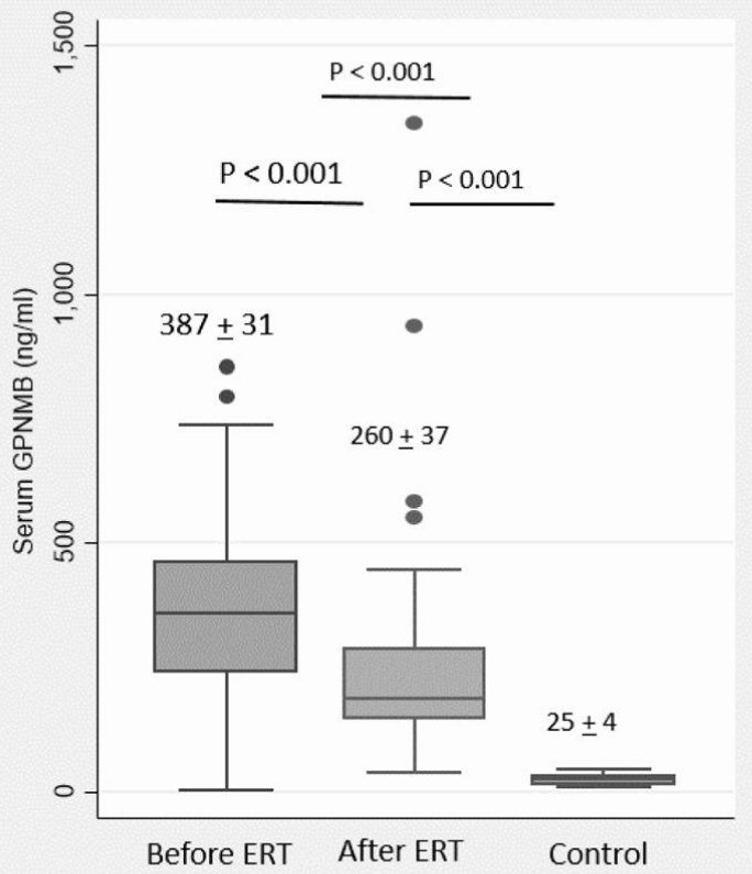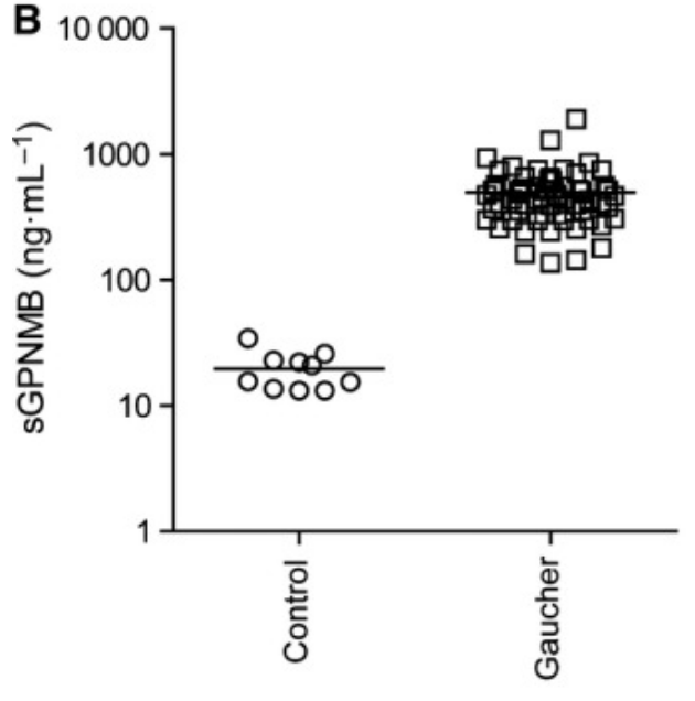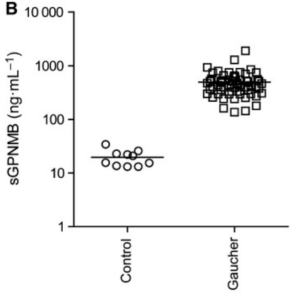 And this result has been independently validated (Click here to read that report). The second study used a larger cohort of individuals with Gaucher disease (155 patients) and they found a >15-fold elevation of GPNMB in the blood of this group (compared to controls). And again these high levels were reduced when the Gaucher group started treatment: