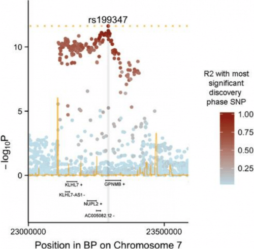As you may also have noticed in the image above, there are five genes (functional sections of DNA) within the affected area of DNA. These genes are KLHL7, KLHL7-AS1, NUPL2, AC005082.12 and (surprise) GPNMB.