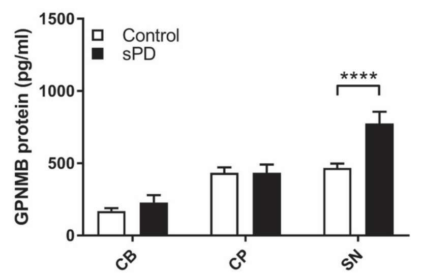 While they found no differences in GPNMB levels in the cerebellum (CB), the caudate/putamen (CP), they did observe a significant increase in GPNMB levels in the substantia nigra of the Parkinson’s cases: