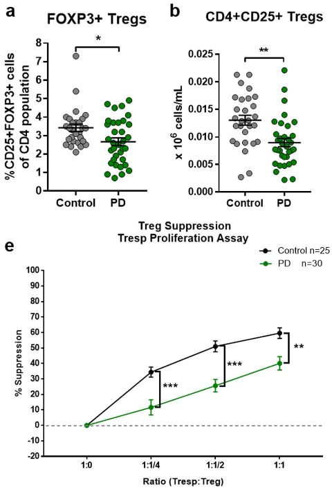When they looked at Treg cells – the cells in charge of maintaining inflammatory homeostasis – the researchers found a significant decline in the number of Treg cells, which resulted in a significant reduction in the immune suppression ability of the PD samples:
