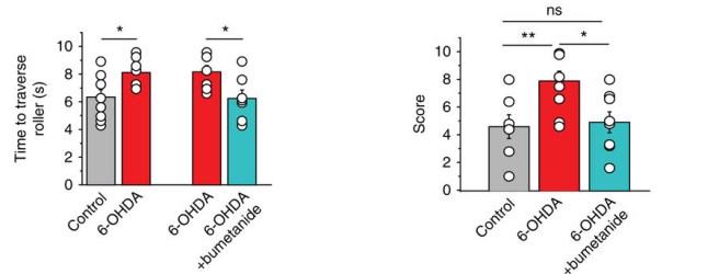 The mice were treated with the neurotoxin 6-OHDA 8 weeks before behaviour testing, and they were treated daily with bumetanide (starting 3 weeks after the neurotoxin was given). These mice could perform the motor tests as well as normal control animals (with an intact dopamine system) and better than untreated mice (with dopamine loss).