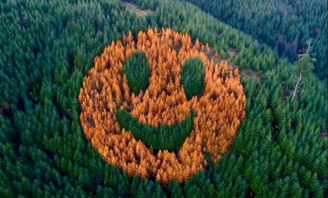 They ‘planted’ a 300 foot wide smiley face on a hill side, by planting larch conifers which are predominantly orange/yellow in a specific arrangement, among the usual evergreen fir trees. Years later, the result is: