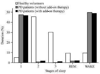 Parkinson’s is associated with increased sleep latency (that is, the length of time that it takes to fall sleep – more specifically, to move from full wakefulness to stage 1 in the image above). It is also associated with increased amounts of stage I sleep and reduced levels of stage 2, 3 and REM sleep: