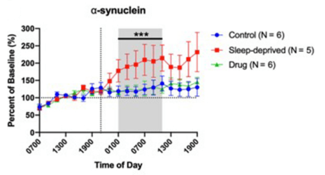 The investigators found that overnight cerebrospinal fluid levels of alpha synuclein concentrations increased during sleep deprivation by approximately 80% (compared to controls). And when the investigators administered sodium oxybate to some of the participants and they observed that this treatment kept alpha synuclein levels at the same as those of the control group: