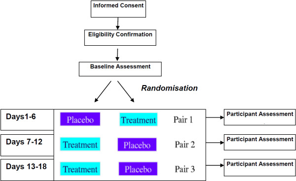 In this study, over 18 days the individual participant will be randomly exposed to three different periods of treatment.