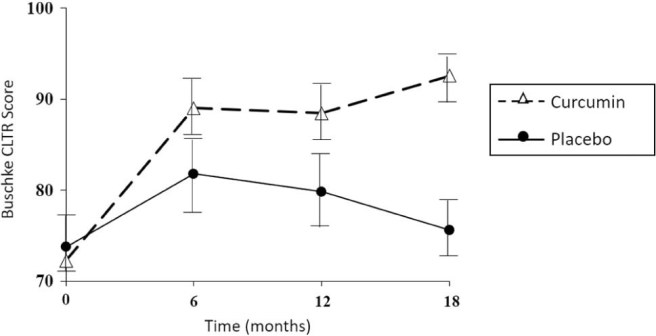 At 18 months, the researchers found that the Theracurmin-treated group had significantly improved their performance on many of the memory tests, compared to the placebo group (and remember that these were non-demented adults). As you can see in the graph below, the Theracurmin-treated group were 15 points better on the Buschke Selective Reminding Test (a verbal memory assessment) than the placebo group at the end of the study:
