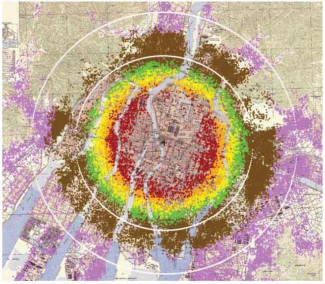 As you assess survival beyond the 1 mile radius (the red, orange, yellow and green dots), the number of survivors living beyond the 1950s increases, providing researchers with a (very unfortunate) dataset for investigating the effects of lower doses of ionizing radiation.
